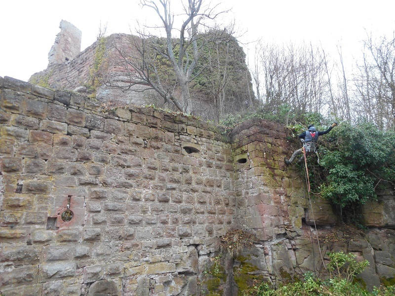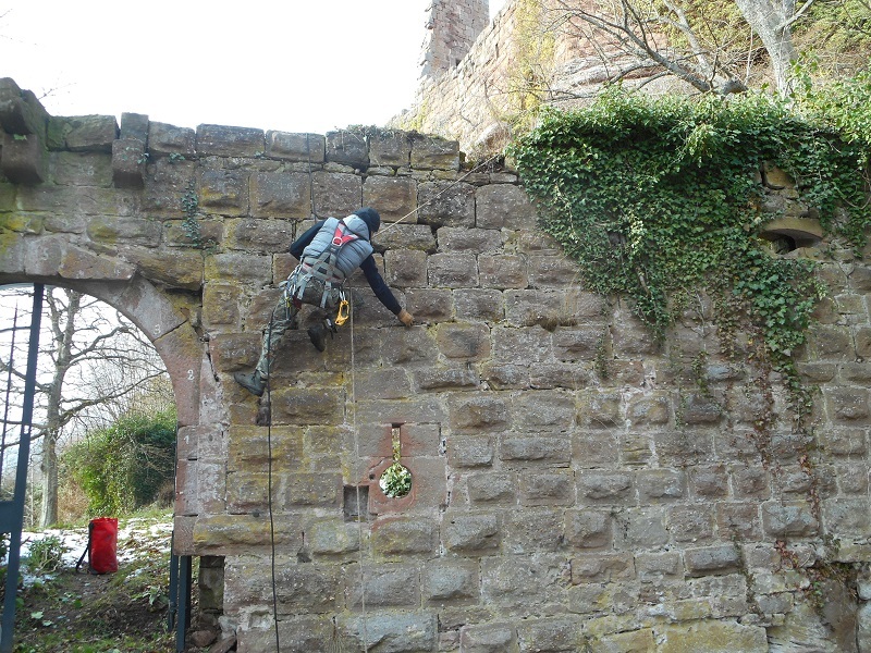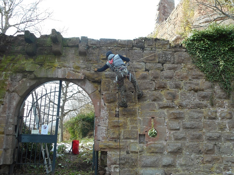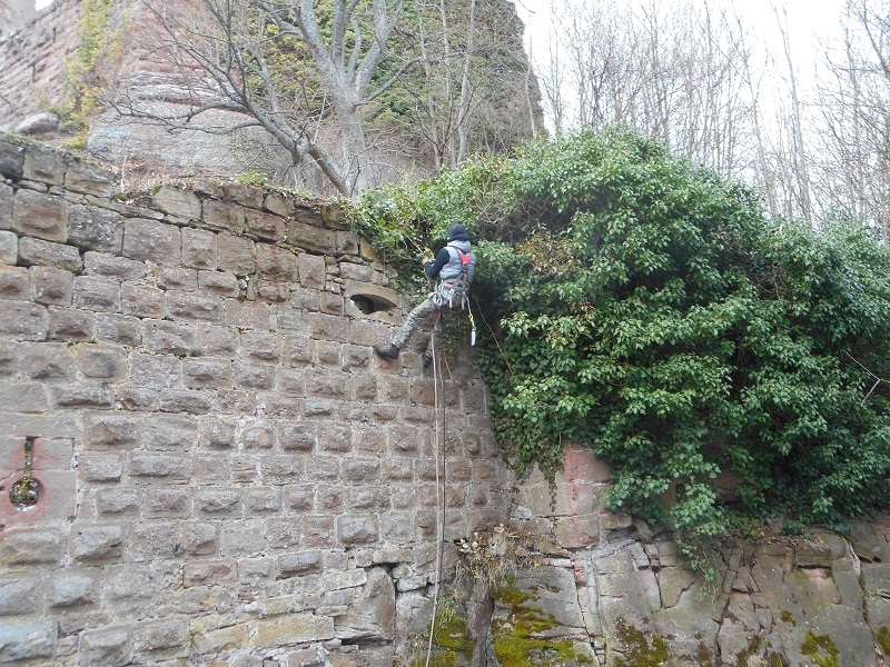 Le nettoyage se poursuit sur le reste du mur où un énorme paquet de lierre menace sa stabilité.