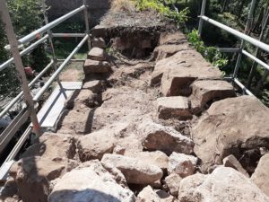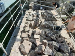 La consolidation de la poterne Est avance à grands pas…. Le haut du mur a été complètement nettoyé et les 2 dernières rangées de parements ont pu être remises en place. A présent c’est l’arase qui est en préparation…