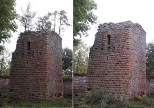Le JCB a ensuite été bien utile pour couper les arbres poussant sur le versant  Ouest, inaccessible de l’intérieur du fait de l’instabilité de la structure. Un seul petit arbre logé dans la porte Ouest n’a pas pu être coupé, car inaccessible sans risques.