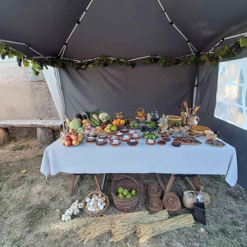 un stand avec des aliments et des ustensiles de cuisine médiévale
