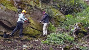Le rocher nettoyé, il faut aussi enlever les souches des arbres qui sont en train de le fendre en plusieurs morceaux …