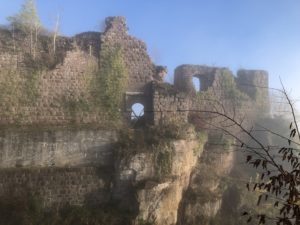 Le mur du palas côté fossé semble encore debout… Bien que lui aussi il pourrait tomber à n’importe quel moment, puisque le rocher s’affaisse …